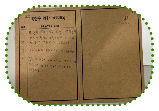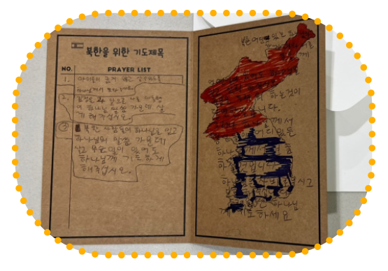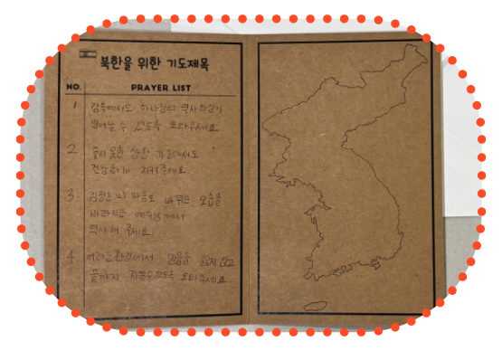 지난 7월에 열린 모퉁이돌 선교 캠프에 온 친구들이 감옥에 갇혀서도 믿음을 포기하지 않는 북한 성도들의 상황을 듣고 쓴 기도 제목이에요. 우리가 직접 북한에 가지는 못해도 어려움 겪는 북한 친구들을 기억하여 기도하는 것만으로도 하나님이 기뻐하시는 선교를 이룰 수가 있어요. 오늘부터 북한에 있는 친구들을 위한 기도 선교의 첫 날을 시작해 볼까요?