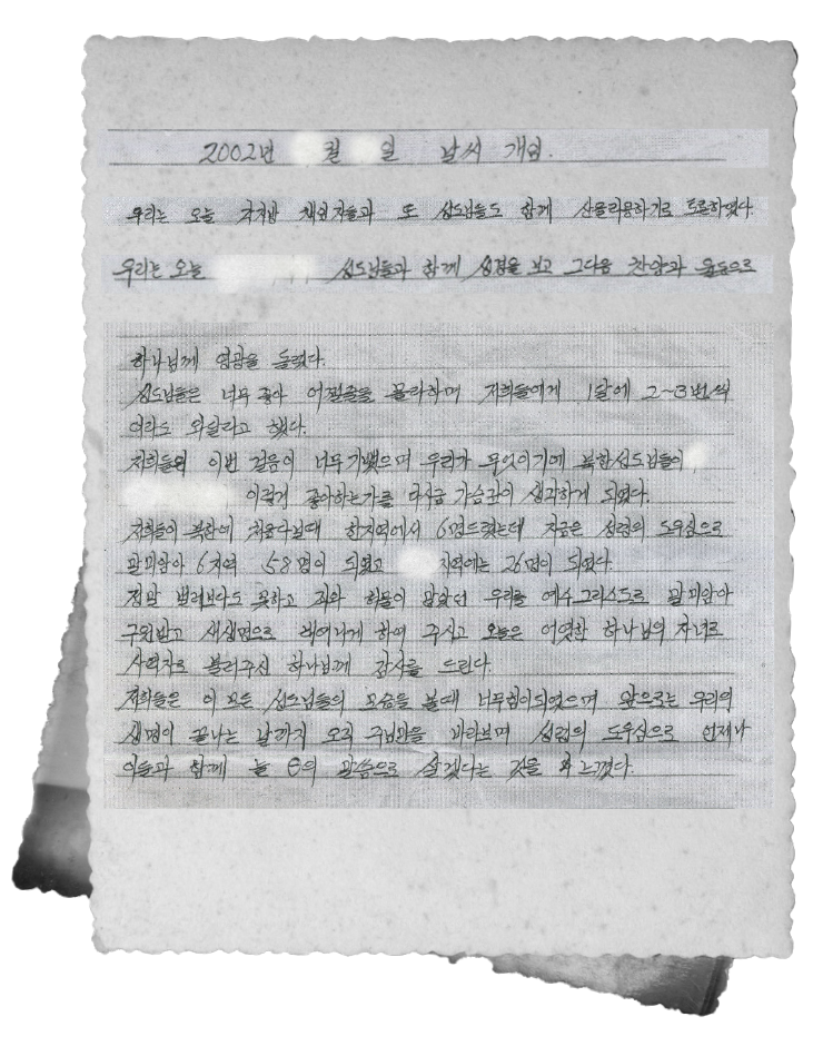 2002년 ○월 ○일 날씨 개임 우리는 오늘 각 지방 책임자들과 또 성도님들과 함께 산을 리용하기로 토론하였다. 우리는 오늘 성도님들과 함께 성경을 보고 그 다음 찬양과 율동으로 하나님께 영광을 돌렸다. 성도님들은 너무 좋아 어쩔 줄을 몰라 하며 저희들에게 1달에 2~3번씩이라도 와 달라고 했다. 저희들의 이번 걸음이 너무 기뻤으며 우리가 무엇이기에 북한 성도님들이 이렇게 좋아하는가를 다시금 가슴 깊이 생각하게 되였다. 저희들이 북한에 처음 다닐 때 한 지역에서 6명 드렸는데 지금은 성령의 도우심으로 말미암아 6지역 58명이 되였고 ○○지역에는 26명이 되였다. 정말 벌레보다도 못하고 죄와 허물이 많았던 우리를 예수 그리스도로 말미암아 구원받고 새생명으로 태여나게 하여 주시고 오늘은 어엿한 하나님의 자녀로 사역자로 불러주신 하나님께 감사를 드린다. 저희들은 이 모든 성도님들의 모습을 볼 때 너무 힘이 되였으며 앞으로는 우리의 생명이 끝나는 날까지 오직 주님만을 바라보며 성령의 도우심으로 언제나 이들과 함께 늘 θ의 말씀으로 살겠다는 것을 느꼈다.